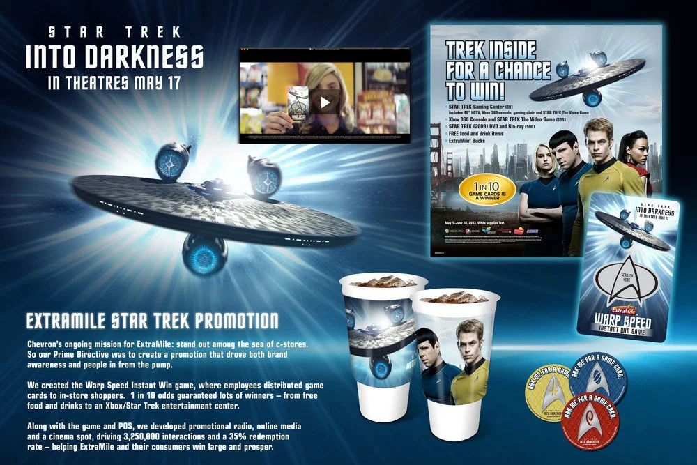 Chevron's ongoing mission for their ExtraMile channel: stand out among the sea of c-stores. So our Prime Directive was to create a promotion that drove both brand awareness and people in from the pump. We created the Warp Speed Instant Win game, where employees distributed game cards to in-store shoppers, with tons of instant winners. Along with the game and POS, we developed promotional radio, online media and a cinema spot – driving 3,250,000 interactions and a 35% redemption rate, helping Chevron ExtraMile and their customers win large and prosper.